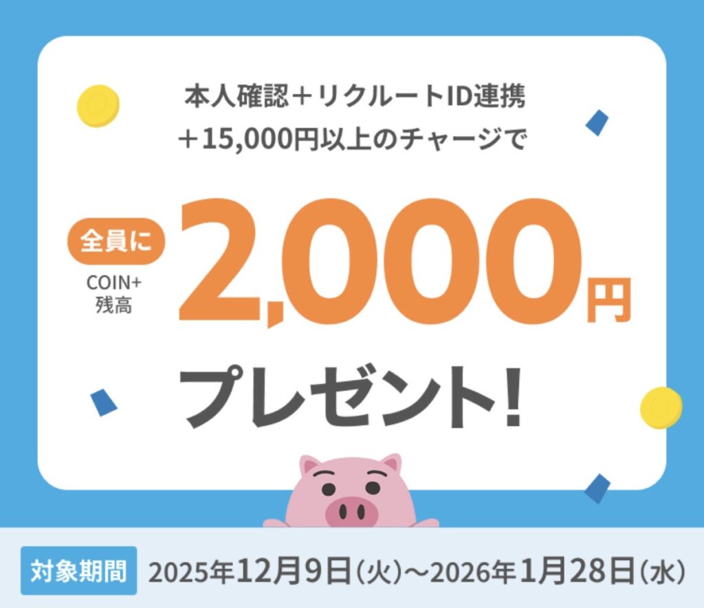 本人確認+リクルートID連携+15,000円以上チャージで、全員に2,000ポイント付与されます。