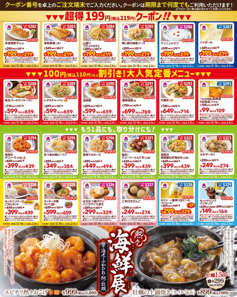 席にあるタブレット注文画面で、クーポン画像に書かれている 「クーポン番号」(4桁) を入力すると、自動で割引が適用されます。