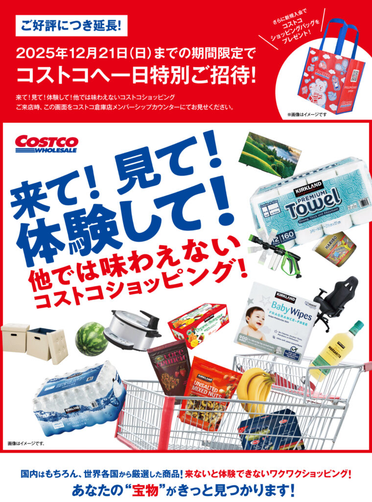 「周りに会員がいない…」という場合におすすめなのが、コストコ公式の期間限定キャンペーンを利用する方法です。コストコは不定期に非会員向け1日無料入場キャンペーン(通称:1日特別ご招待券)を実施しており、2025年も好評につき延長されました。例えば2025年は9月末までの予定が12月21日(日)まで延長され、「会員じゃなくてもコストコに入れる!」とSNSでも話題になっています。