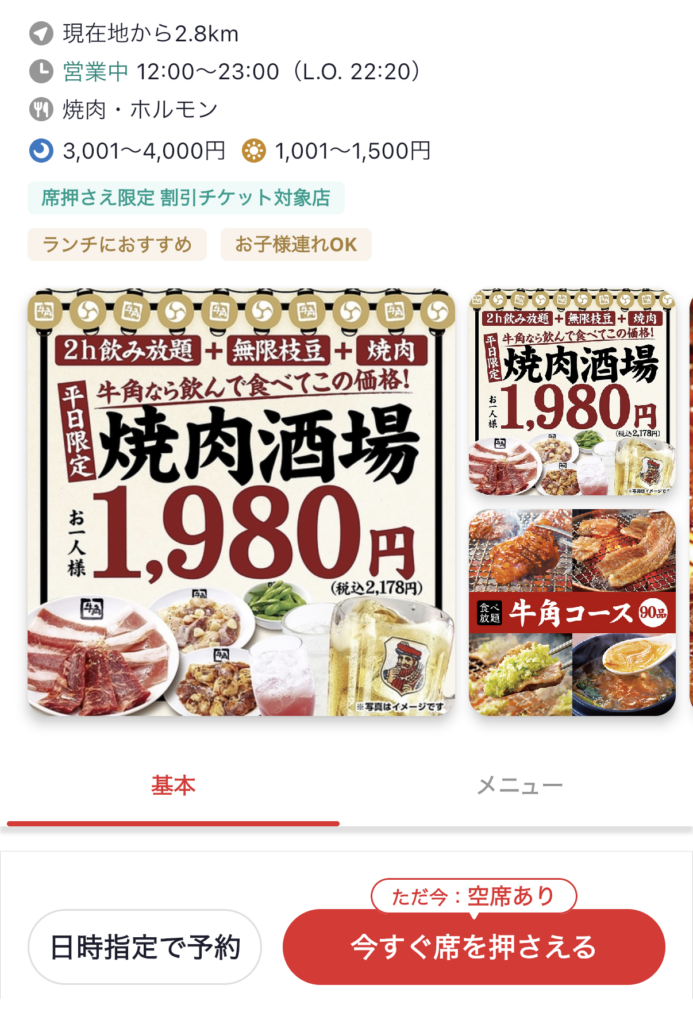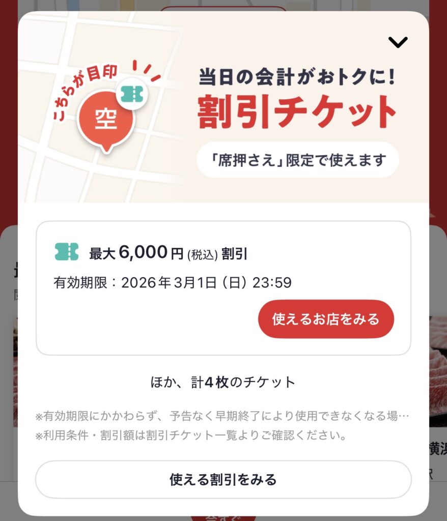 - 店舗詳細ページに「席押さえ限定割引チケット対象店」