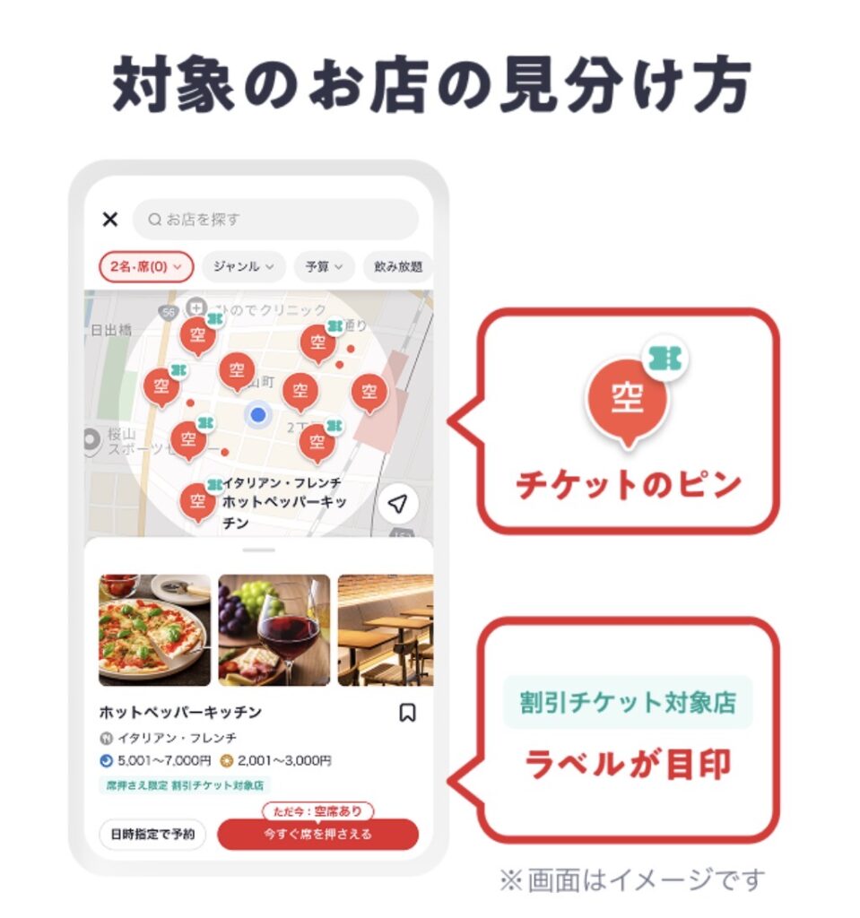 - 「空き」と表示されている店舗でチケットマークが付いている店