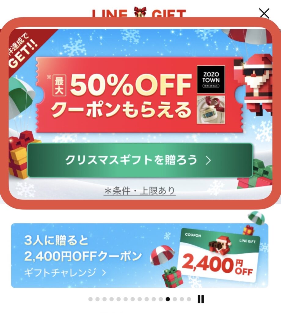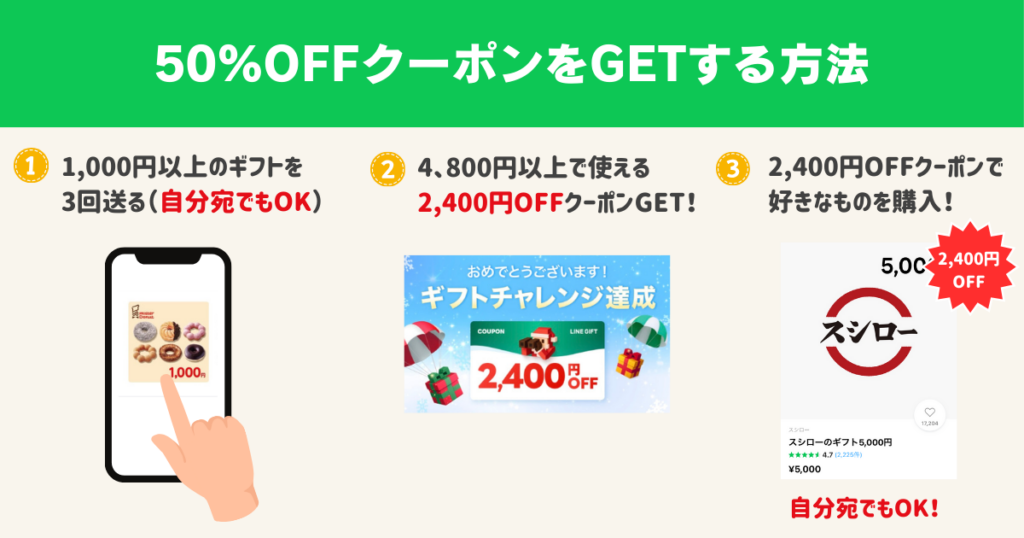 - 条件達成後にもらえるLINEギフト50%OFFクーポン