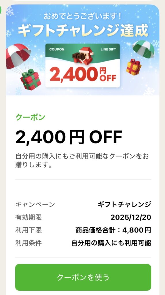 LINEギフトのギフトチャレンジは、指定の条件を達成すると割引クーポンがもらえる期間限定キャンペーンです。