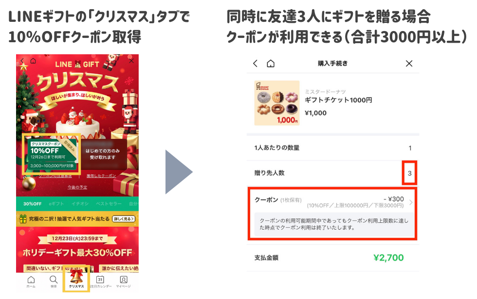 一度に友達3人に贈るなら「クリスマス10%OFFクーポン」が使えます!