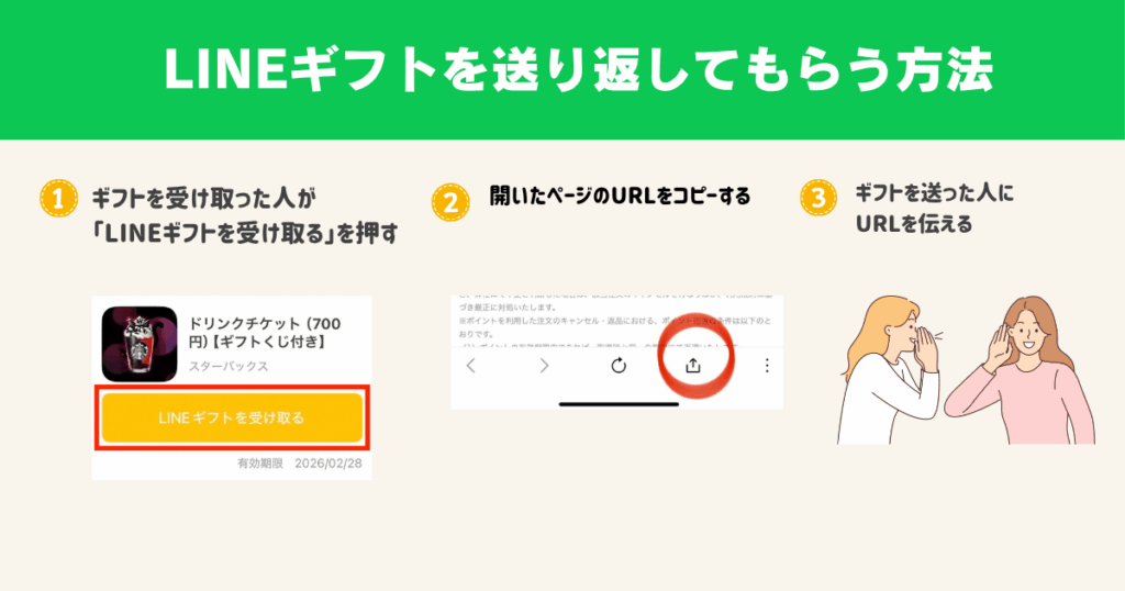 LINEギフトは、ギフトを受け取った側が送り主にリンクを共有することでギフトを送り返すことができます。