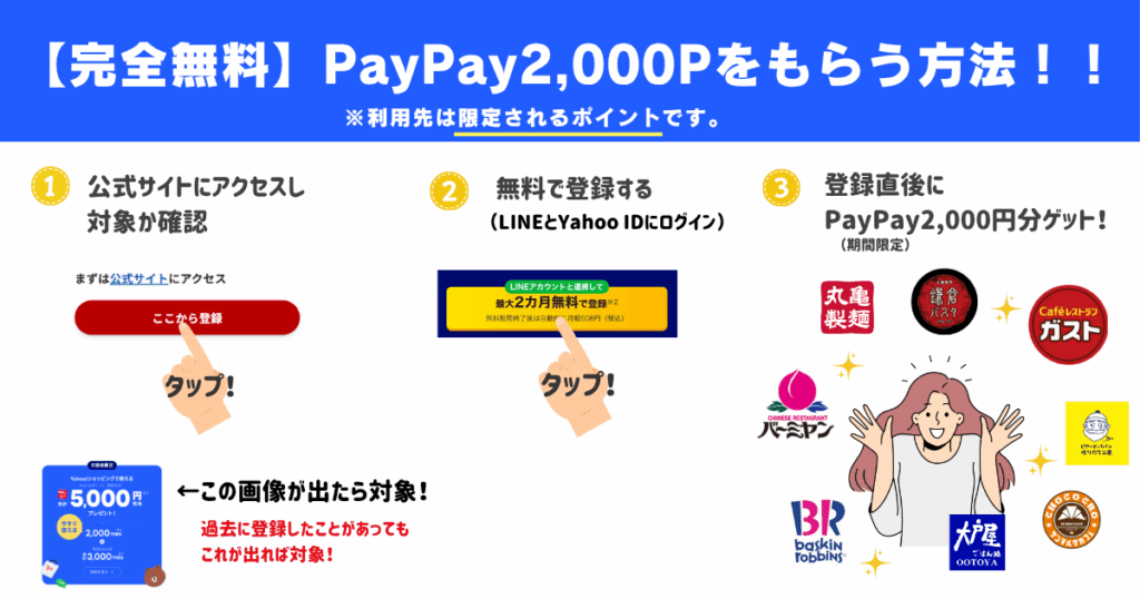 • 無料登録だけで2,000円分のPayPayポイント(期間限定)がすぐにもらえる!