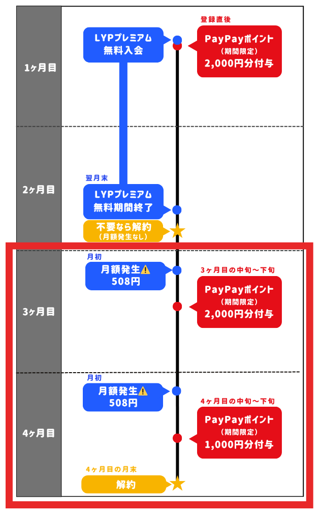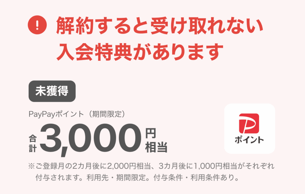 その後、月額を払って継続するとさらに3ヶ月目にPayPay2,000円分、4ヶ月目にPayPay1,000円分が付与されます。