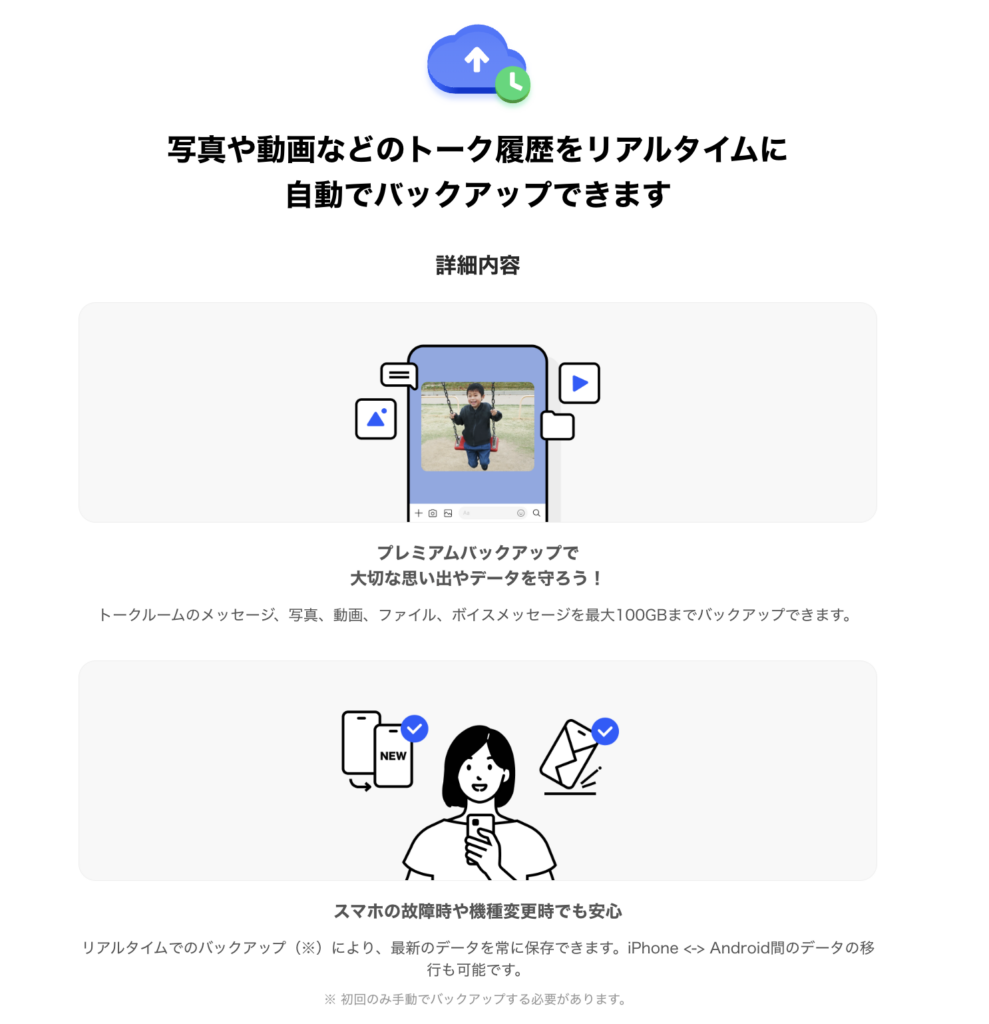 写真や動画などのトーク履歴をリアルタイムに自動でバックアップできます!(最大100GBまで)