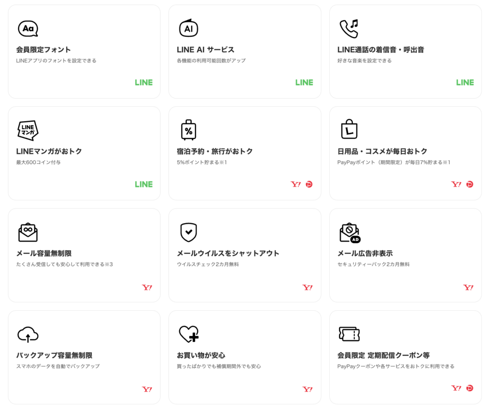 LINEスタンプ1500万種類が使い放題だったり、Yahoo!ショッピングが毎日7%還元など嬉しい特典が数多くあります。(詳しくはこちら)