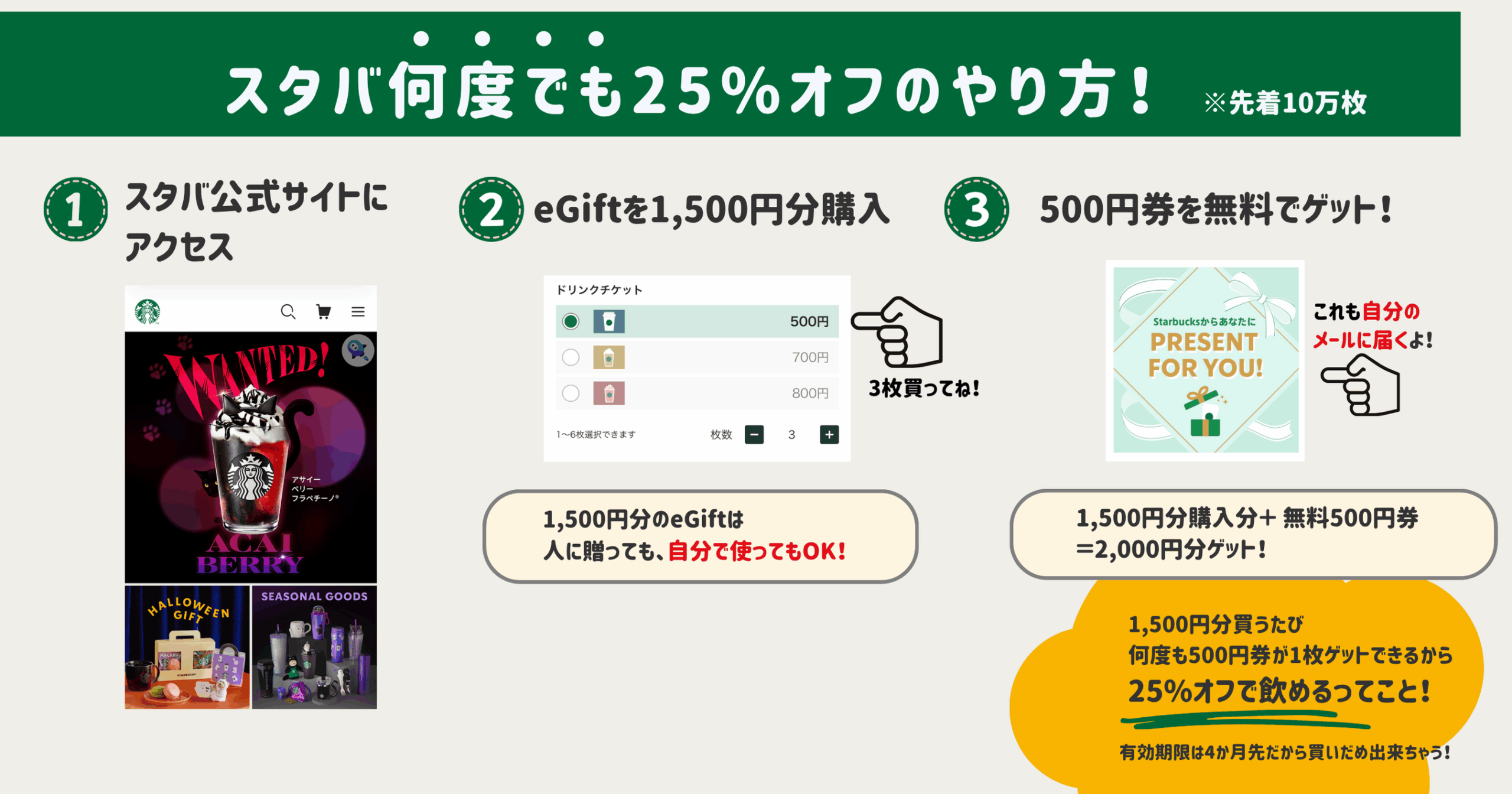 ゆきまま1500円購入で、2000円分のスタバギフト券が手に入るから25%オフってこと!しかもなくなるまで何度も購入できるよ!