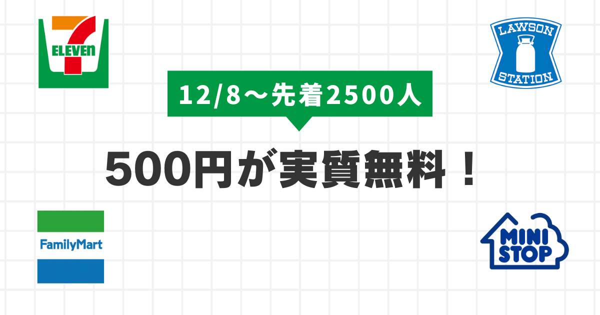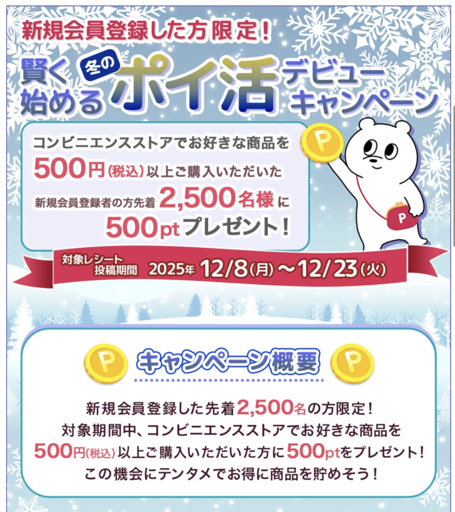 テンタメに 2025年12月8日以降に新規会員登録した人限定 で、コンビニで税込500円以上の買い物をしてレシートを投稿すると、500ptがもらえるというポイ活デビュー応援企画です。