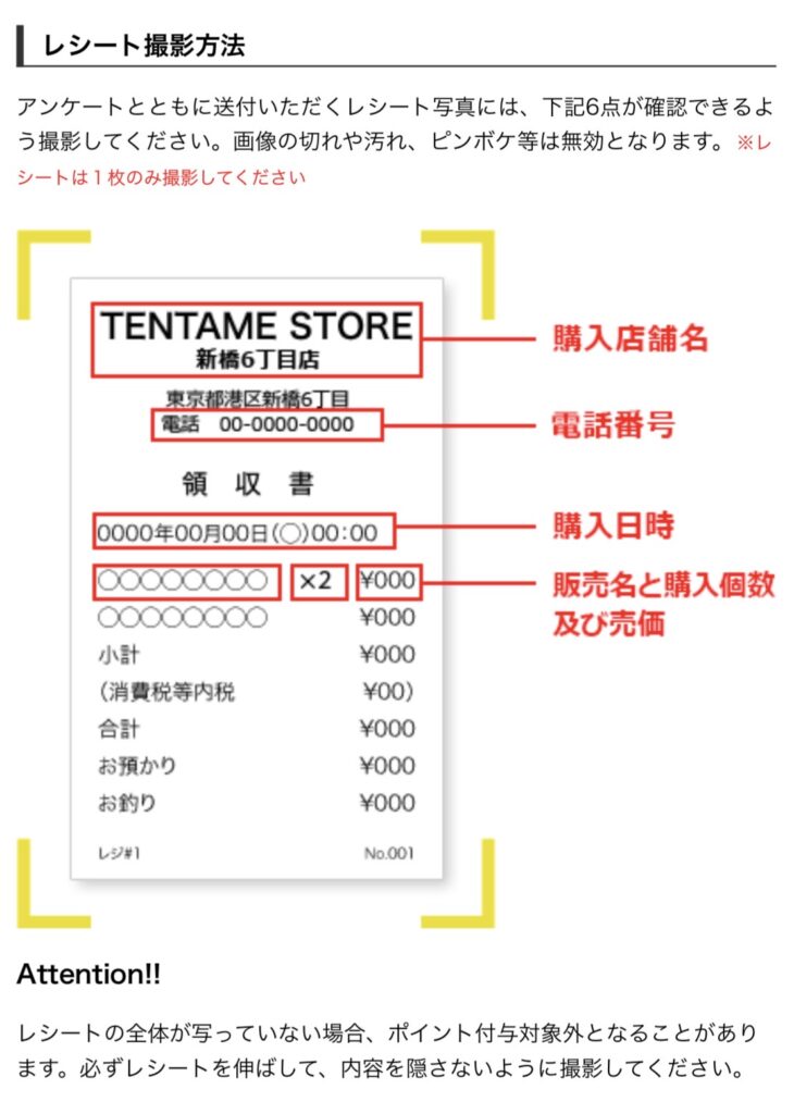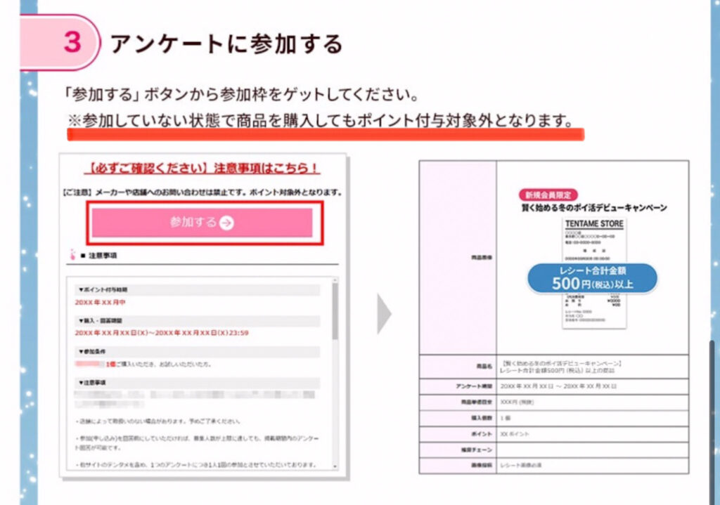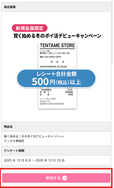 必ず参加ボタンを押してから購入したレシートを提出してください。