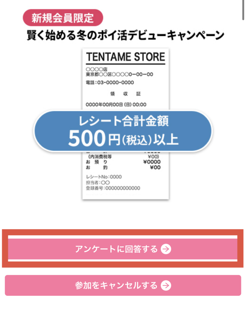 必ず参加ボタンを押してから購入したレシートを提出してください。